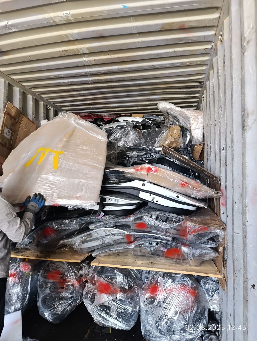 - Konteyner daxilində paletlərlə və streçlə bükülmüş böyük həcmdə avtomobil ehtiyat hissələri.